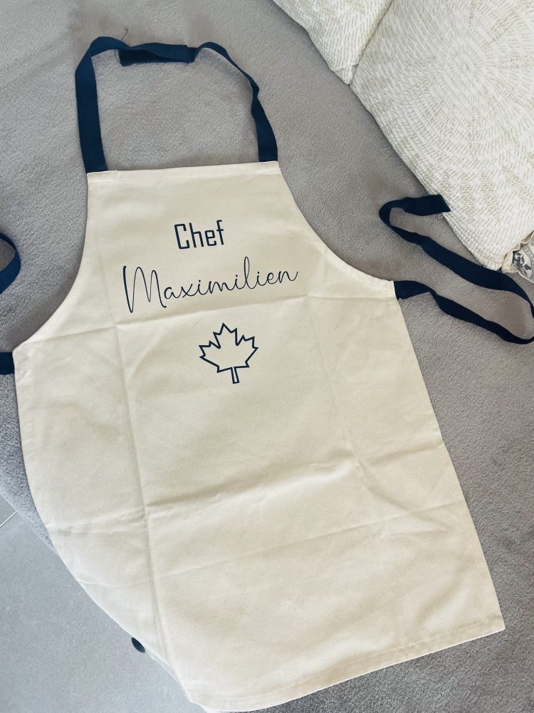 – le titre souhaité (exemple « Chef », « Cheffe », « Petit Chef », « Pâtissier », « Cuisinier », « Bricoleur », autres…) (le titre sera inscrit dans la même police que les modèles en photo)